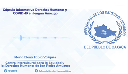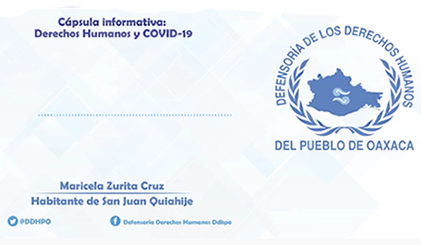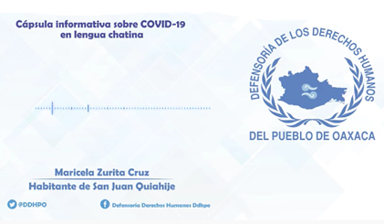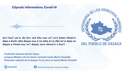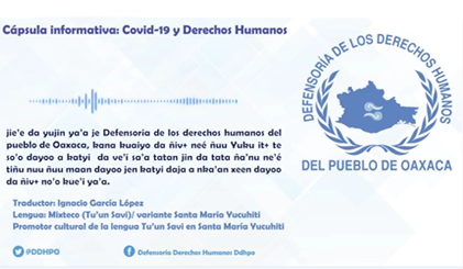![]() Cápsula informativa sobre Covid-19 y Derechos Humanos, traducido a la lengua Mixteca (Tu’un Savi)/ variante Santa María Yucuhiti, por el promotor cultural de la lengua Tu’un Savi en Santa María Yucuhiti, Ignacio García López. VER |