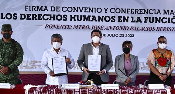Signan convenio de colaboración DDHPO y municipio de Oaxaca de Juárez Boletín 045 | 2022-07-18 ![]() El defensor de los Derechos Humanos del Pueblo de Oaxaca, Bernardo Rodríguez Alamilla y el edil del municipio de Oaxaca de Juárez, Francisco Martínez Neri, firmaron un Convenio de Colaboración para promover un mejoramiento sustancial del ejercicio de la función policial y fortalecer el ejercicio de los derechos humanos de las personas que habitan y transitan en la capital del estado. Durante la firma del acuerdo realizada este lunes 18 de julio, al término del pase de lista de los elementos policiales, el ombudsperson Bernardo Rodríguez Alamilla resaltó que uno de los grandes retos que todo gobierno municipal tiene, es lograr fortalecer sus capacidades institucionales para prestar servicios de calidad, respetuosos de los derechos humanos de sus habitantes. Acompañado por el presidente municipal capitalino, Francisco Martínez Neri y el secretario de Seguridad Ciudadana, Movilidad y Protección Civil de dicho ayuntamiento, Raúl Ávila Ibarra; el defensor de los Derechos Humanos detalló que poco más del 50 por ciento de las quejas recibidas por el organismo que representa están relacionadas con actos cometidos por autoridades municipales, principalmente, de aquellas localidades con alta densidad poblacional. Ante la coordinadora Territorial para la Construcción de la Paz en Oaxaca, Karina Barón Ortiz; el secretario de Seguridad Pública de Cadereyta Jiménez, Nuevo León, José Antonio Palacios Beristaín, reiteró que la seguridad pública, es una de las mayores exigencias de la ciudadanía hacia su gobierno municipal, pero también, una de las que mayores retos representa, pues implica repensar la manera en cómo se concibe la propia seguridad pública. Con la asistencia de las regidoras de Seguridad Ciudadana, Movilidad, Agencias y Colonias, así como la de Derechos Humanos de Oaxaca de Juárez, Claudia Tapia Nolasco y Mirna López Torres, respectivamente, además de decenas de elementos de la corporación policial municipal, el ombudsperson señaló que es necesario transitar de un modelo de seguridad pública a otro de seguridad ciudadana, que implica la intervención y participación activa de todos los actores que conforman la sociedad. Este cambio de visión, explicó, implica generar capacidades en los elementos policiacos para que en su actuación no se vulneren derechos humanos, sobre todo en el uso legítimo de la fuerza, derechos de las y los servidores públicos, derechos de las niñas, niños y adolescentes e incluso en temas de la función policial bajo una perspectiva de género. Rodríguez Alamilla advirtió que ningún modelo de seguridad pública o ciudadana tendrá éxito, si no se dignifica la labor de las y los policías, pues se debe reconocer que de manera histórica y discriminatoria fueron abandonas y abandonados, e incluso obligados a realizar trabajos para los cuales no fueron contratados. Resaltó que, de acuerdo con datos de la organización Causa Común A.C., uno de los retos que enfrentan las y los policías de todo el territorio mexicano, se refiere a cumplir con actividades que no corresponden al desempeño de sus funciones. Y en este sentido, puntualizó, de acuerdo a encuestas realizadas por dicha asociación civil, un porcentaje importante de policías en México han manifestado haber recibido órdenes para realizar encargos personales, pagar cuotas para que no se les castigue, votar por un candidato político o bien, asistir a un mitin. Por lo que, destacó, es tiempo de reconocer y dignificar el oficio de una labor tan delicada, valiosa y sustantiva para la plenitud de un Estado social y democrático de derecho como lo es el trabajo policial, así como instaurar una auténtica carrera de formación de los elementos policiacos, con salarios y prestaciones dignas para una profesión altamente riesgosa. De igual forma, señaló que es importante generar una coordinación eficiente entre los distintos cuerpos policiales del país, con mecanismos de vigilancia y control del actuar de dichos servidores públicos, pues ello, además de asegurar su correcto actuar, fortalece la confianza de la ciudadanía en dichas corporaciones. Durante su participación, el edil de Oaxaca de Juárez, Francisco Martínez Neri, agradeció la colaboración de la Defensoría para la firma del convenio, pues ello demuestra el compromiso y la voluntad para hacer frente a los desafíos que enfrenta el municipio. Por su parte, la regidora de Seguridad Ciudadana, Movilidad, Agencias y Colonias, Claudia Tapia Nolasco, indicó que es indispensable garantizar y generar una cultura de los derechos humanos de todas las personas, de ahí la importancia de la firma del presente convenio. La coordinadora Territorial para la Construcción de la Paz en Oaxaca, Karina Barón Ortiz señaló que el pleno respeto a los derechos humanos es fundamental para poder garantizar justicia, seguridad y paz a la ciudadanía. Mientras que, el secretario de Seguridad Ciudadana, Movilidad y Protección Civil del municipio de Oaxaca de Juárez, Raúl Ávila Ibarra resaltó la importancia que las y elementos de seguridad sean capacitados en el respeto a los derechos humanos, además de reconocer el cambio de paradigma en materia de seguridad implementado por el actual presidente municipal. Al término de la firma de convenio, se realizó la Conferencia Magistral "Los Derechos Humanos en la Función Policial” a cargo del secretario de Seguridad Pública de Cadereyta Jiménez, Nuevo León, José Antonio Palacios Beristaín, quien hizo un repaso histórico sobre los Derechos Humanos y resaltó que éstos no son un obstáculo para el orden público y la seguridad ciudadana, sino por el contrario, una herramienta en la función policial. También, reiteró la importancia de que los elementos de seguridad conozcan los mandatos legales y tratados internacionales que los facultan en el ejercicio de 